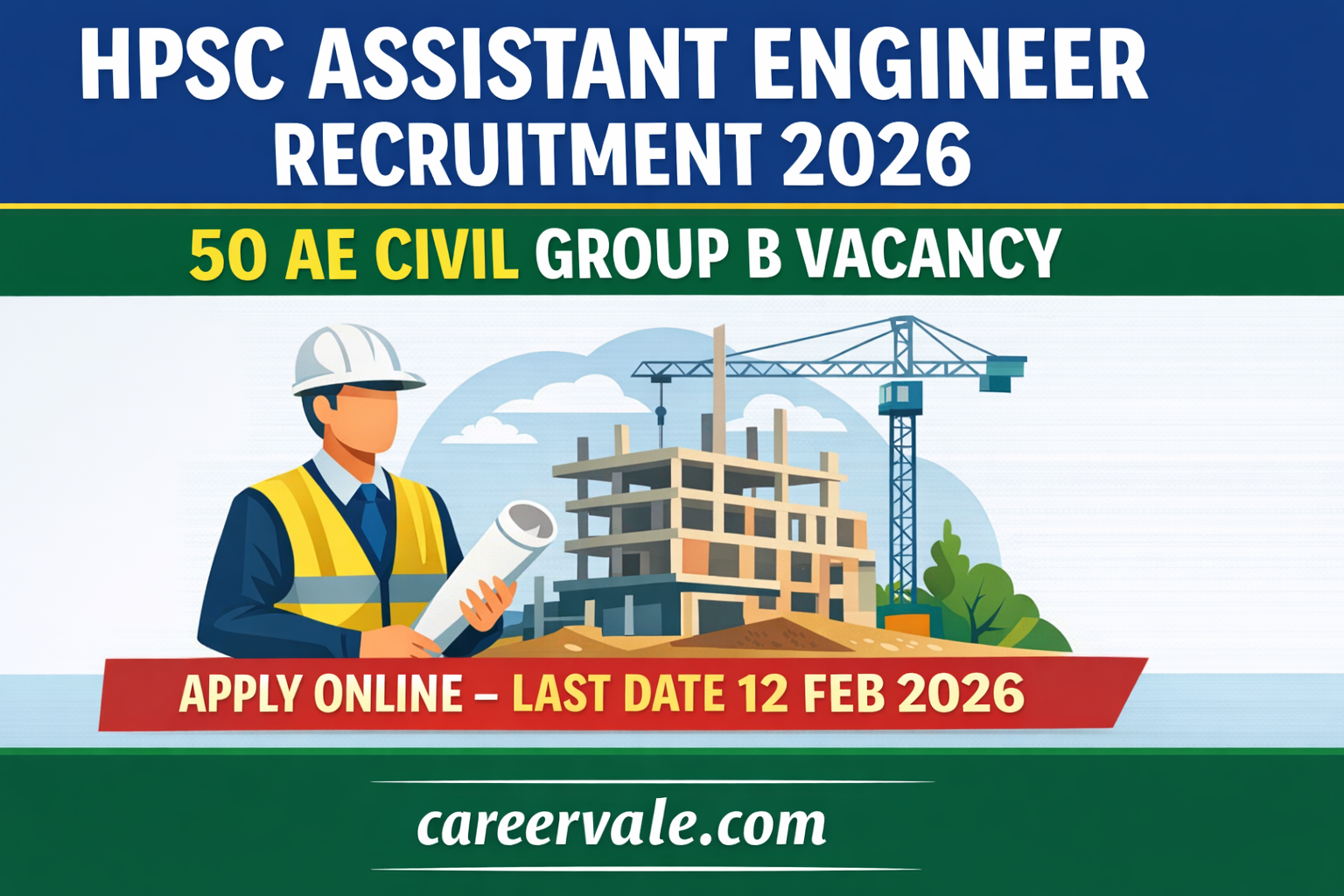 HPSC Assistant Engineer Group B Recruitment 2026 Civil Engineers ke liye ek bahut hi acchi opportunity hai, jisme 50 posts, attractive salary aur Haryana Government ki secure job milti hai. Agar aap eligibility criteria complete karte hain, to last date ka wait na karein aur 12 February 2026 se pehle online apply kar dein. Is tarah ki latest government job updates ke liye careervale.com ko bookmark karna na bhoolen.